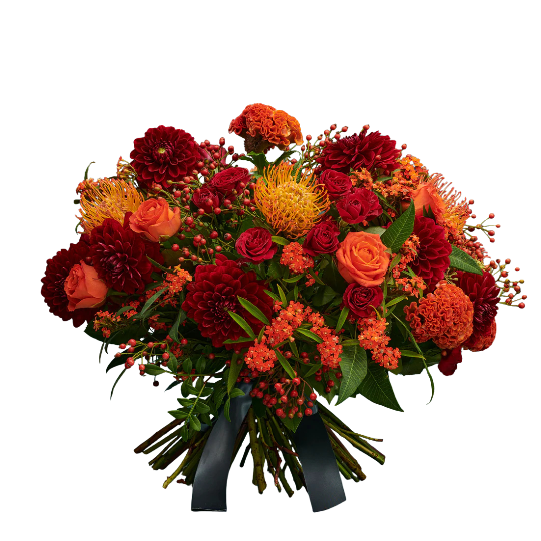 if you want a pop of colour then you need to choose this design, with its bright oranges and reds its an eye-catching mix of flowers chosen from celosia, protea, euphorbia, spray roses and dahlias.