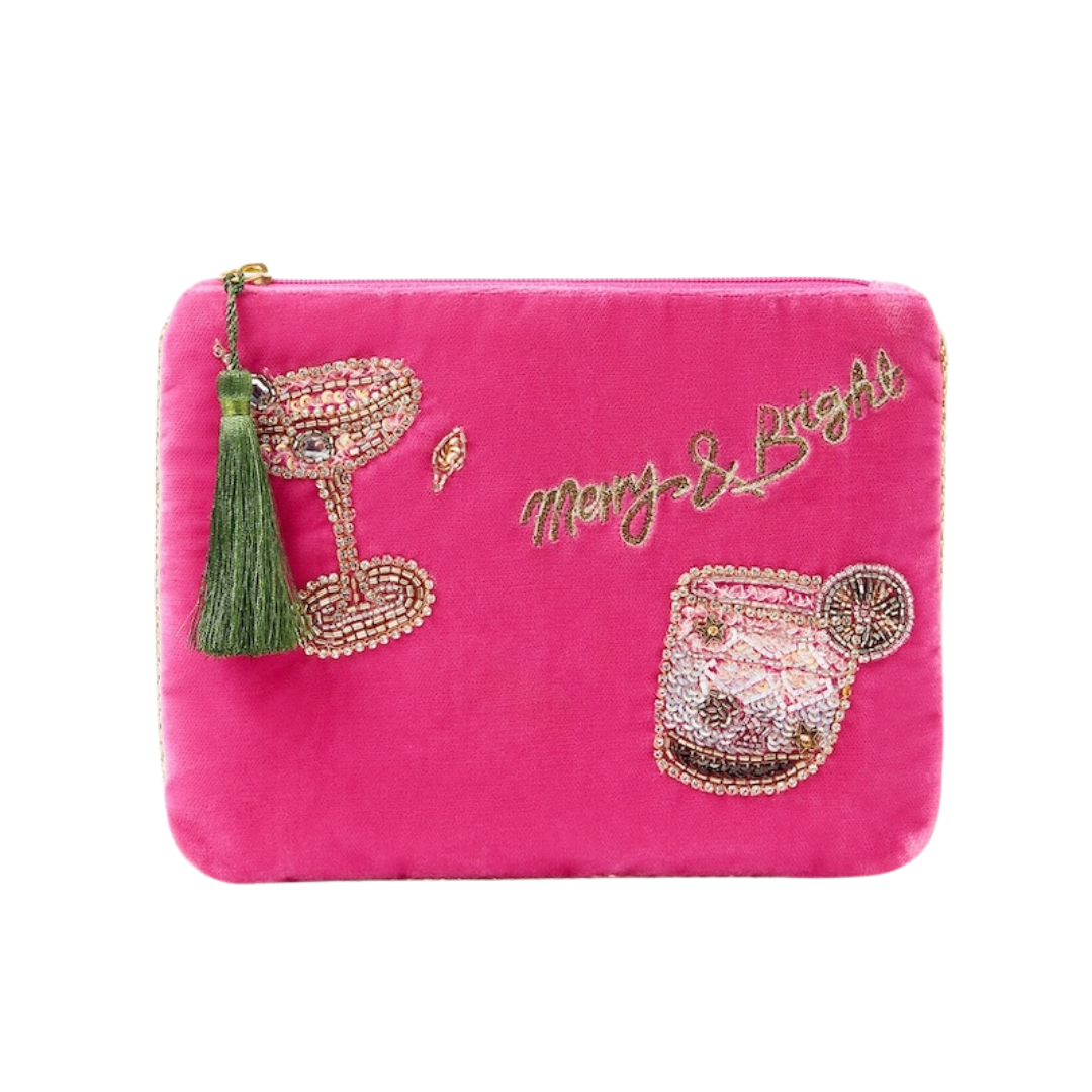May your days (and accessories) be merry and bright! A cute gift for anyone this Christmas, this pouch is designed in pink velvet with beautifully beaded cocktail motifs stitched on the front.