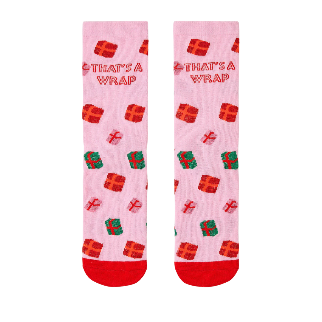 Made from a soft blend in bubblegum pink and festive red, these socks showcase a pattern of perfectly wrapped presents with 'That's A Wrap' below the top hem.