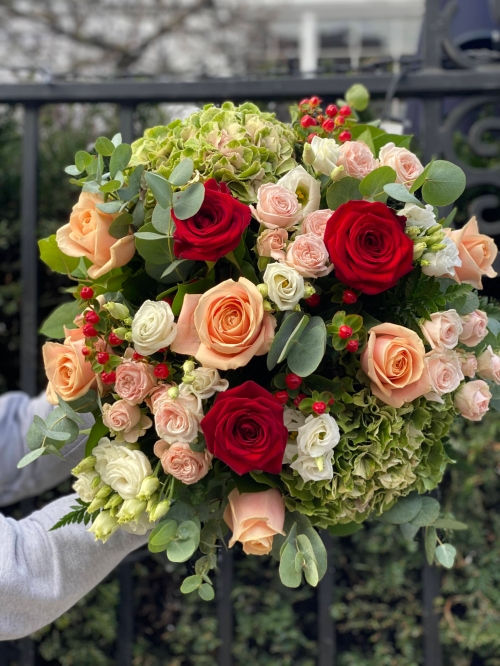 The Je Taime arrangement is a captivating blend of deep reds, soft peaches, blush pinks, and whites, accented with beautiful crisp greens.