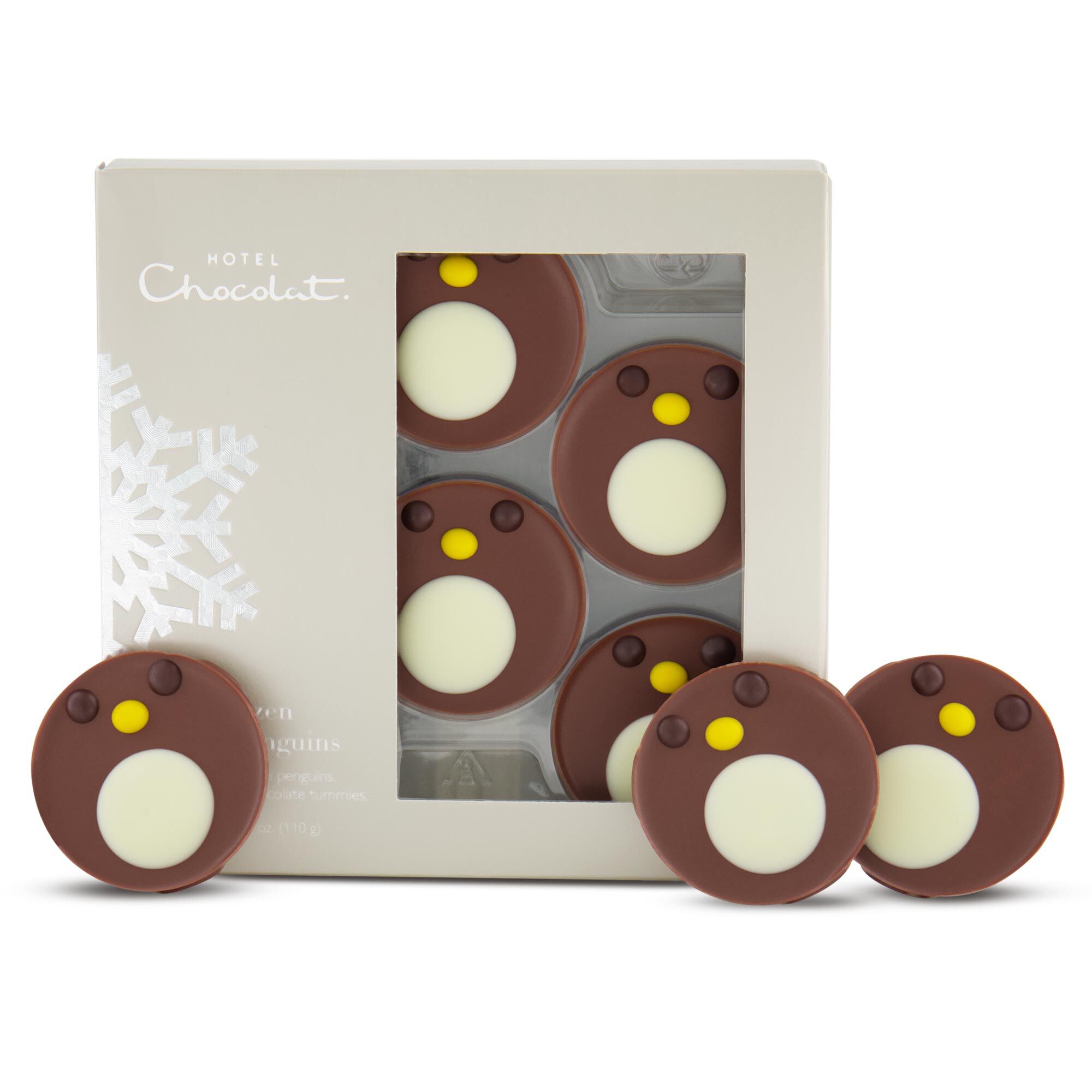 Four snug little penguins, all wrapped up in 40% milk chocolate.